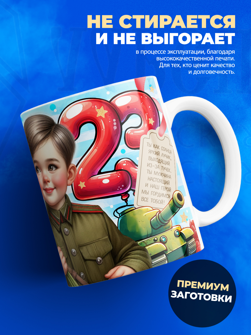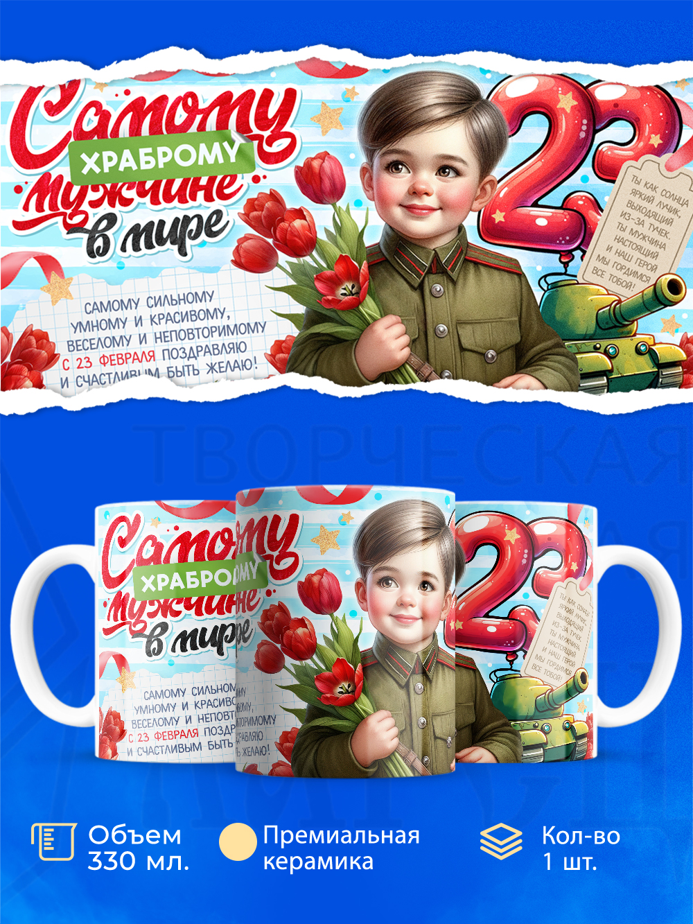 Ищете идеальный подарок на 23 Февраля для мужчины, мальчика или просто друга? Наша яркая и стильная кружка “23 Февраля” станет отличным выбором! Эта прочная и красивая кружка станет не только полезным, но и памятным подарком на День защитника Отечества.