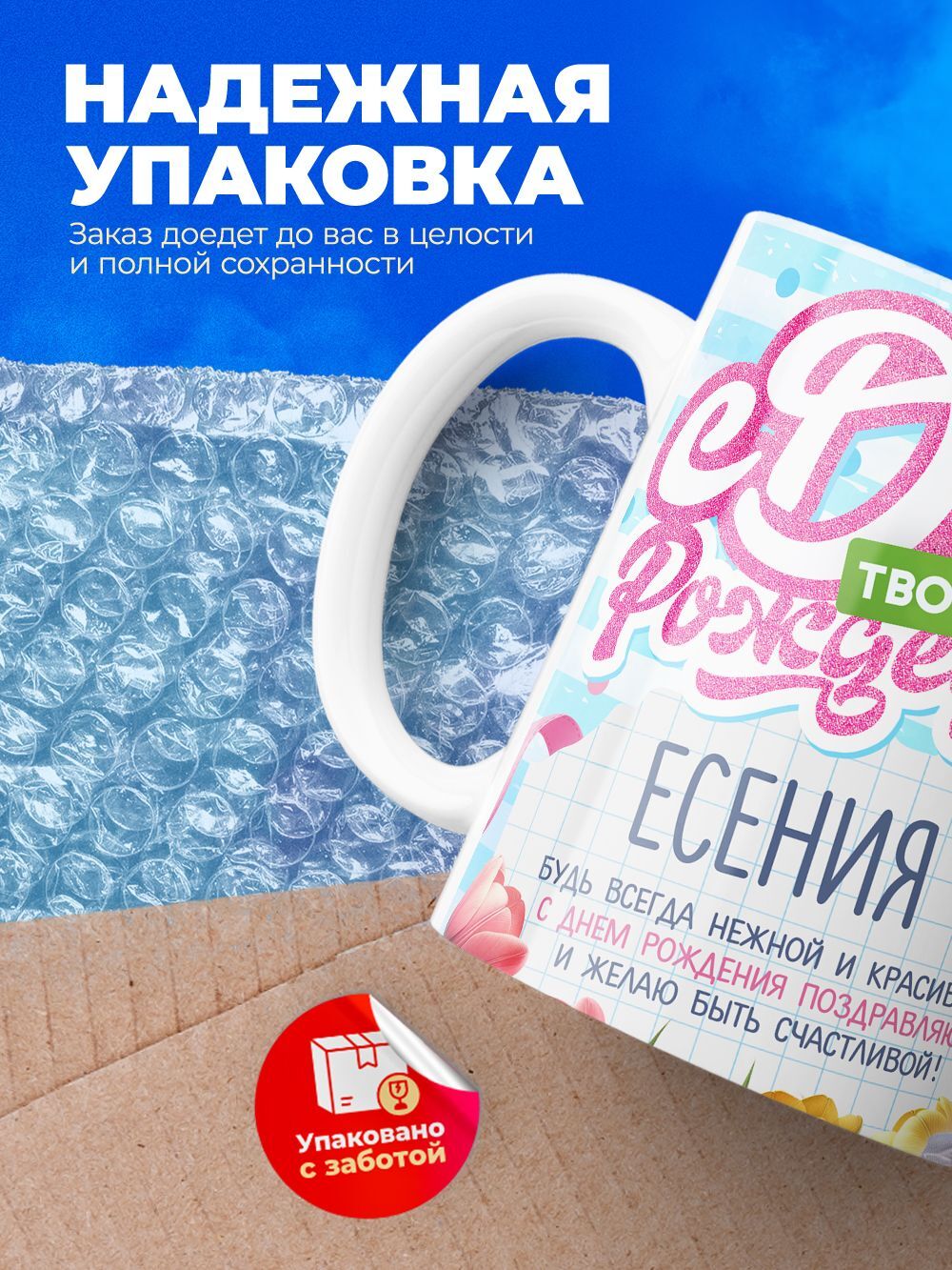 Отличный подарок: керамическая кружка с именем станет прекрасным и оригинальным подарком на день рождения для девочки по имени Есения. Именная кружка: изделие может быть использовано в качестве именного подарка для любой женщины, девочки с именем Есения, а также для тех, кому нравится идея индивидуальных и оригинальных подарков.